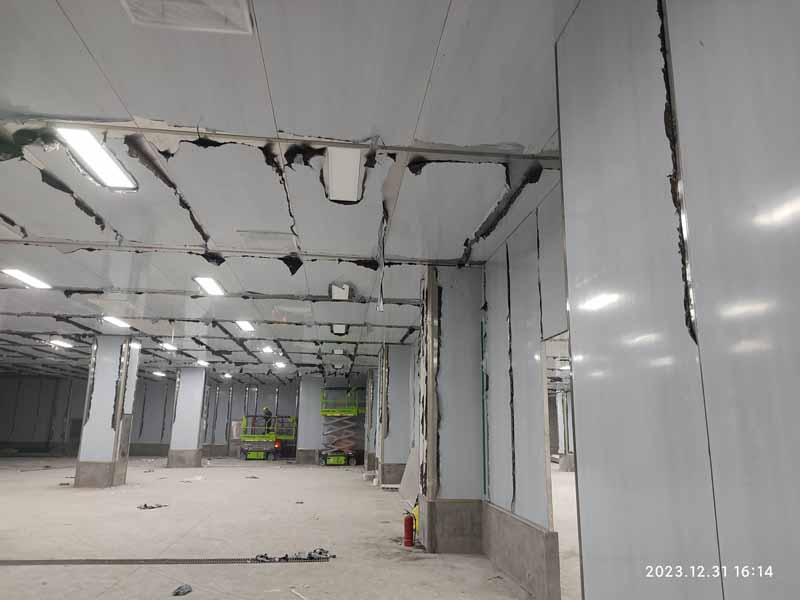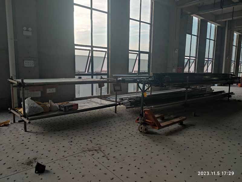 1,第一批彩鋼板到貨 2,貨架搭設(shè),材料分專業(yè)堆碼,3、消防排煙風(fēng)管拆除完成,水管拆除完成20%,待局部調(diào)整標(biāo)高。