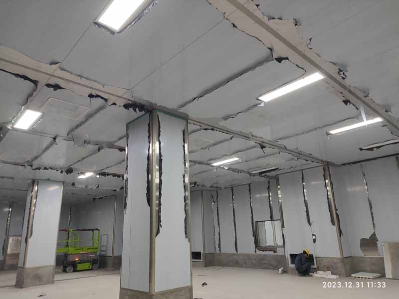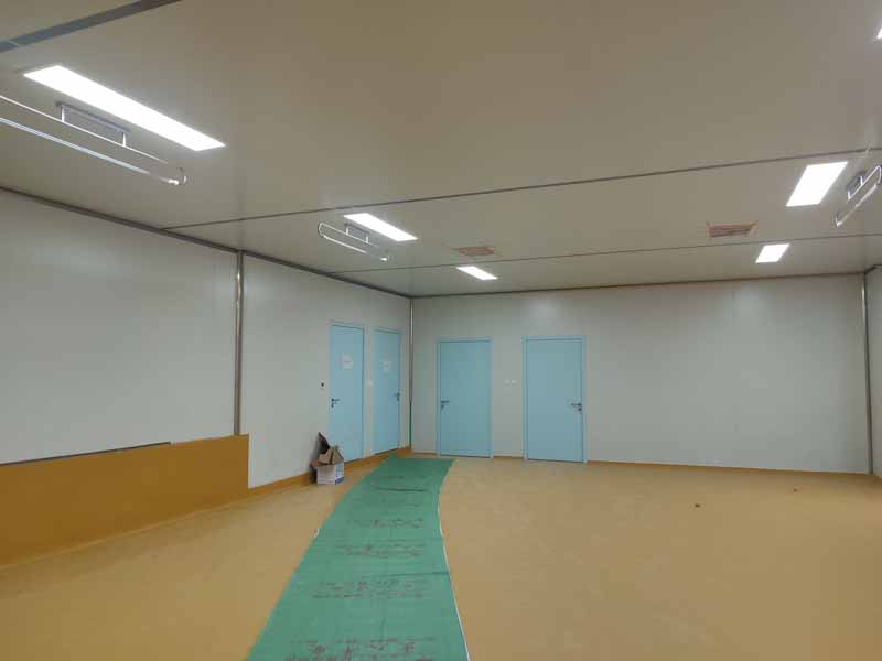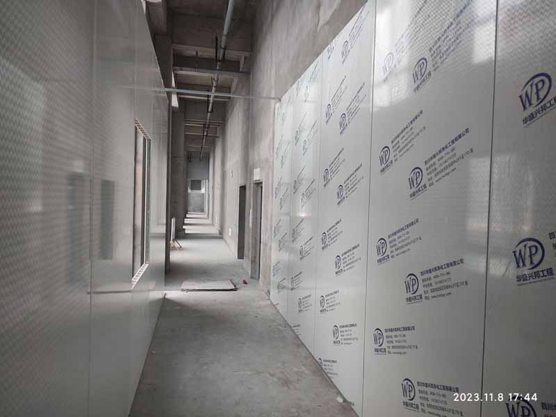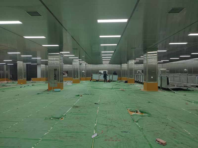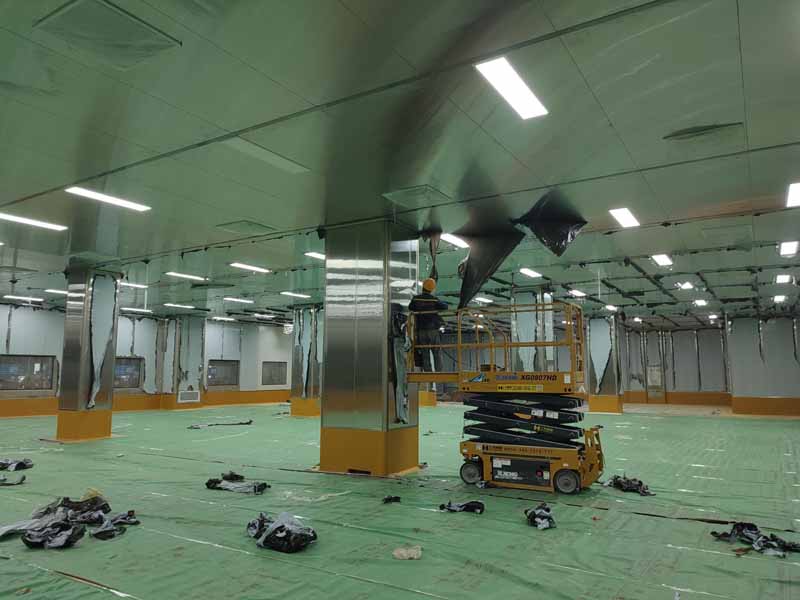 1、頂板撕膜完成65%。 2、紫外燈安裝完成,插座系統(tǒng)完成,工藝管道下降管完成95%,純水管完成,保鮮液管道完成80%,夾層內(nèi)PPR管道完成35%。 3、聚氨酯地坪及成品保護(hù)完成。 4、空調(diào)水末端碰頭管及閥組安裝完成90%。 5、潔凈門窗安裝完成